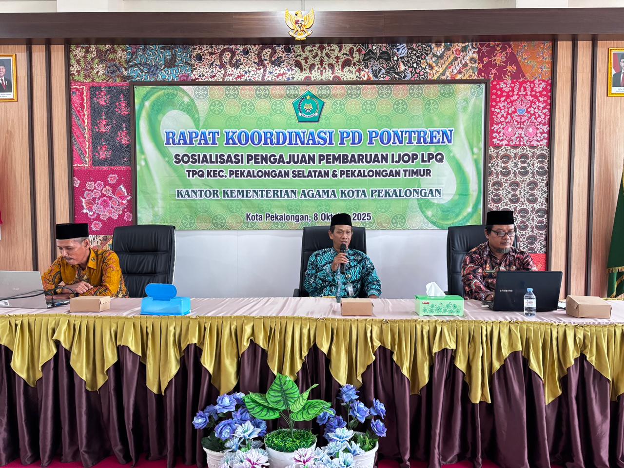 Kota Pekalongan (Humas) – Kantor Kemenag Kota Pekalongan melalui Seksi Pendidikan Agama dan Keagamaan Islam (PAKIS) menggelar Rapat Koordinasi Sosialisasi Pengajuan Pembaruan Izin Operasional (IZOP) Lembaga Pendidikan Al-Qur’an (LPQ) dan Taman Pendidikan Al-Qur’an (TPQ) bagi wilayah Kecamatan Pekalongan Selatan dan Pekalongan Timur, pada Rabu (8/10/2025) di Aula Pusat Layanan Haji dan Umrah Terpadu (PLHUT).