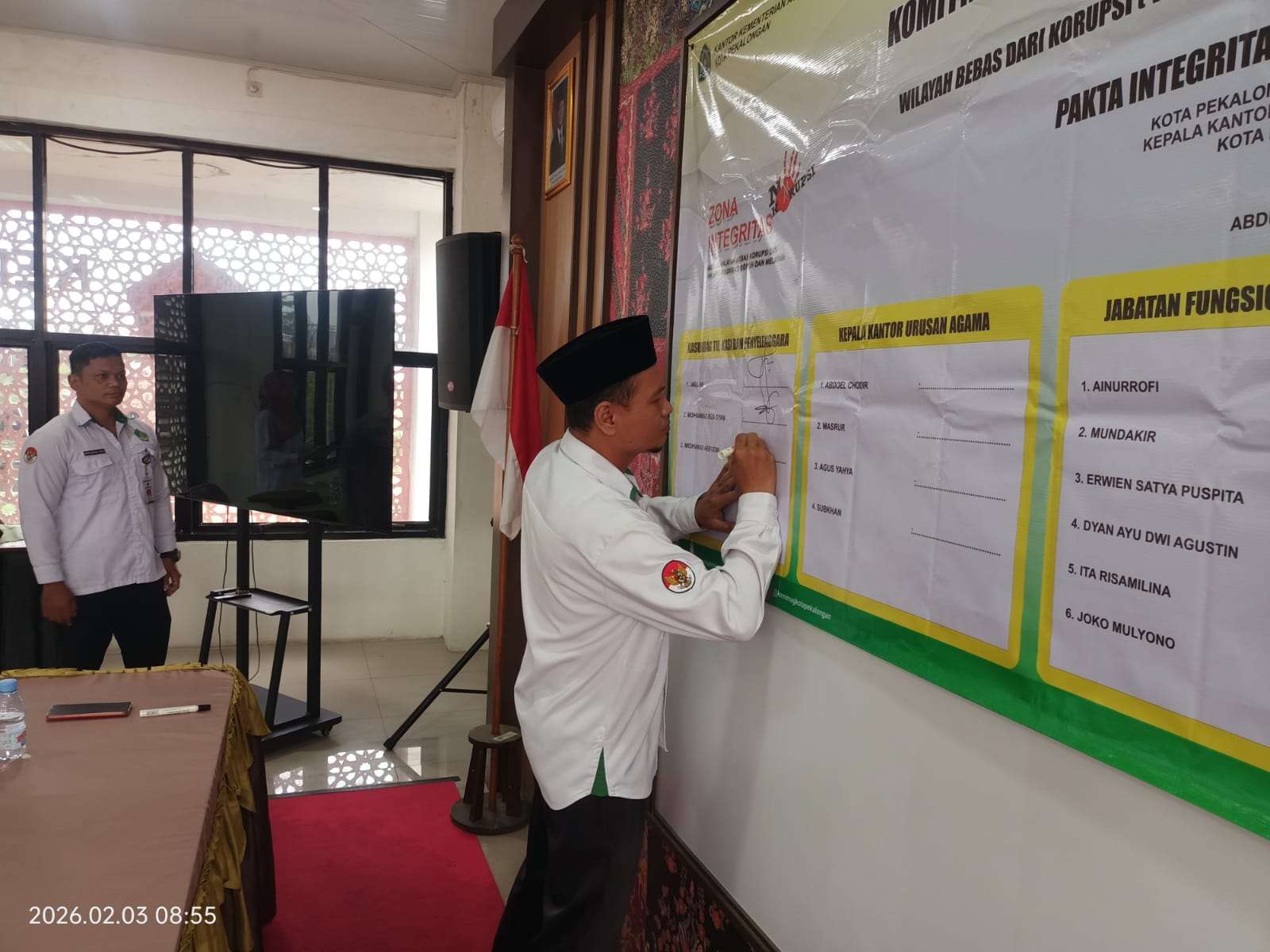 Kota Pekalongan (Humas) – Kantor Kementerian Agama Kota Pekalongan menggelar Komitmen Bersama Penandatanganan Pakta Integritas dan Perjanjian Kinerja Tahun 2026 pada Selasa (3/2/2026). Kegiatan ini merupakan langkah strategis dalam memperkuat Zona Integritas menuju Wilayah Bebas dari Korupsi (WBK) dan Wilayah Birokrasi Bersih dan Melayani (WBBM) serta meningkatkan kualitas kinerja Aparatur Sipil Negara (ASN) Kemenag Kota Pekalongan.