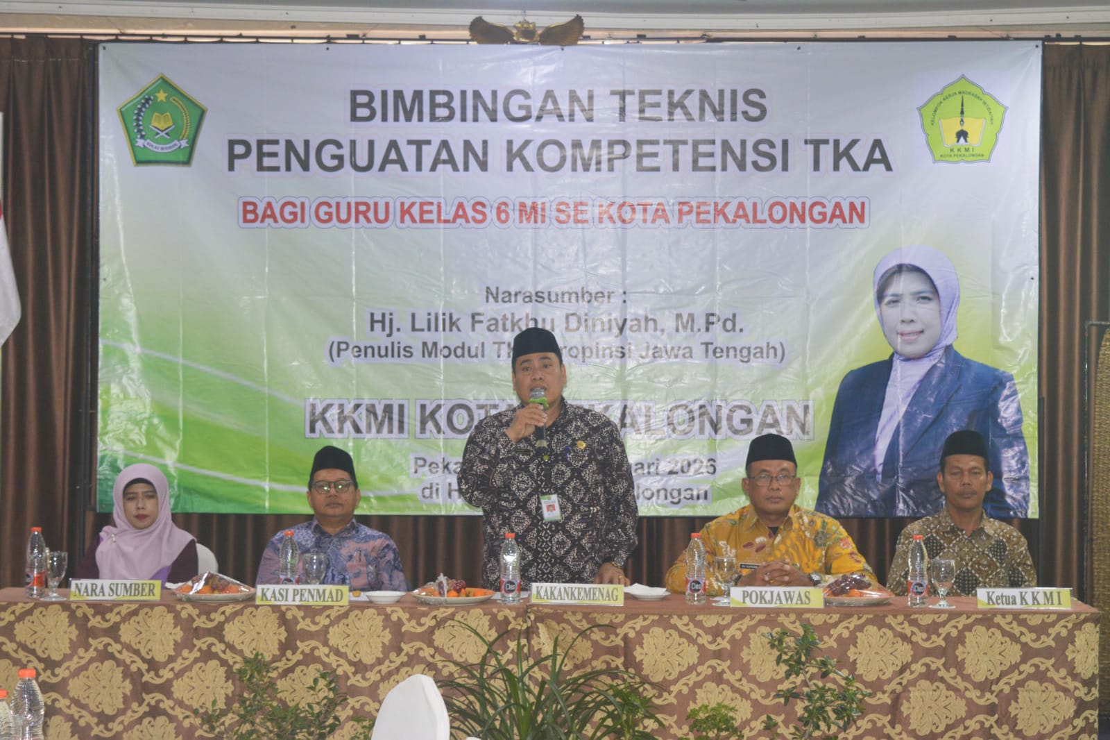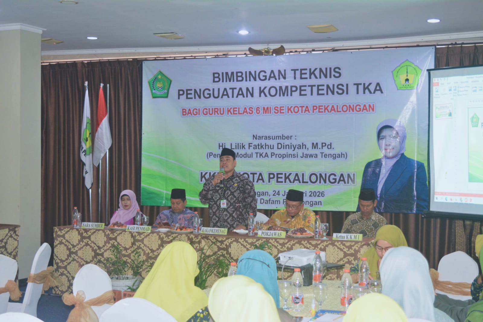Kota Pekalongan (Humas) – Kepala Kantor Kementerian Agama Kota Pekalongan, Dr. H. Abdul Wahab, S.Ag., M.Si., menghadiri kegiatan Bimbingan Teknis (Bimtek) Penguatan Kompetensi Tes Kemampuan Akademik (TKA) bagi guru Madrasah Ibtidaiyah pada Sabtu (24/01/2026) di Hotel Dafam Kota Pekalongan. Kegiatan ini diselenggarakan oleh Kelompok Kerja Madrasah Ibtidaiyah (KKMI) Kota Pekalongan dan diikuti oleh guru kelas VI MI se-Kota Pekalongan sebagai upaya peningkatan mutu pembelajaran dan penilaian pendidikan madrasah.